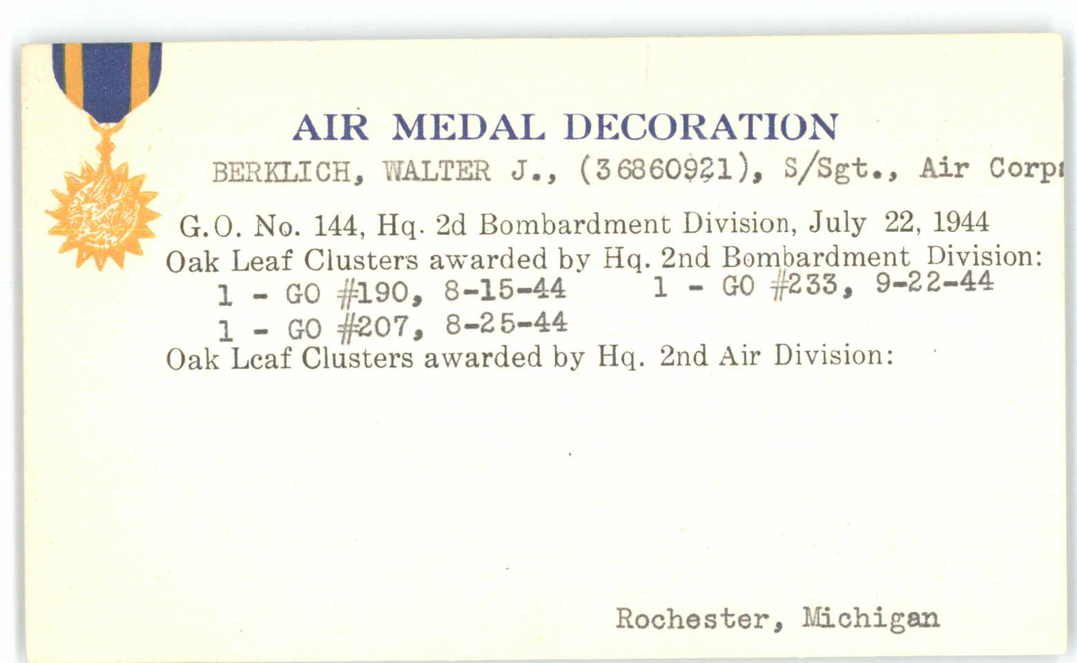 Before the war, Walter worked for Saylor-Beall Manufacturing Company in Detroit. He entered the U.S. Army Air Forces in July 1943 and trained as an aerial gunner and pilot at several stateside bases. His unit was shipped to England and was part of the 8th Air Force.
