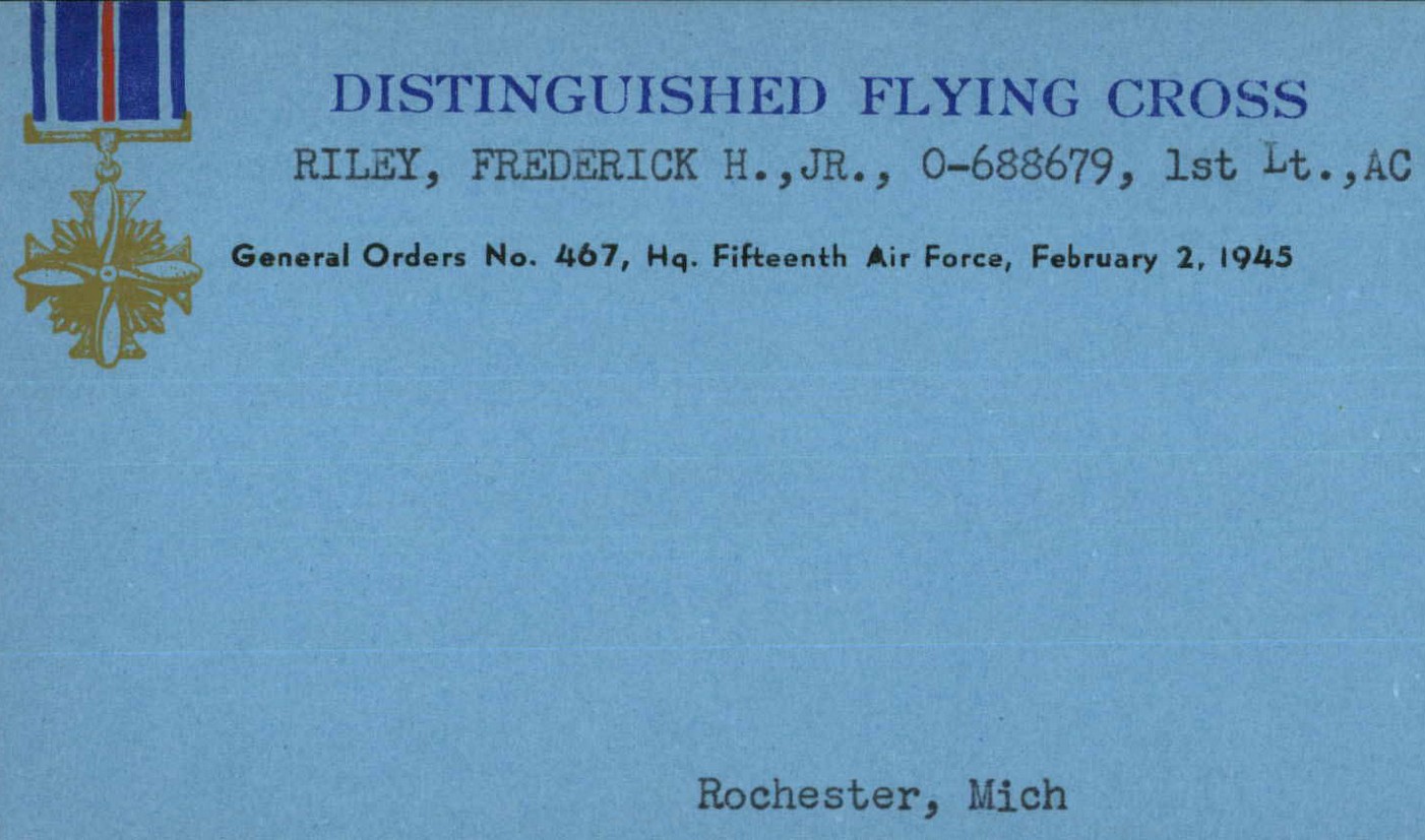 After high school, Fred worked as a clerk in a hardware store and then at Yellow Truck & Coach in Pontiac. He enlisted in the U.S. Army Air Forces in October 1941 and was trained as a bombardier. He was commissioned as a second lieutenant in August 1943. Fred was assigned to the 745th Bomb Squadron of the 456th Bombardment Group based at Stonara Airfield, Italy, in 1944. He flew 41 missions in the B-24 Liberator bomber and was awarded the Air Medal and the Distinguished Flying Cross.