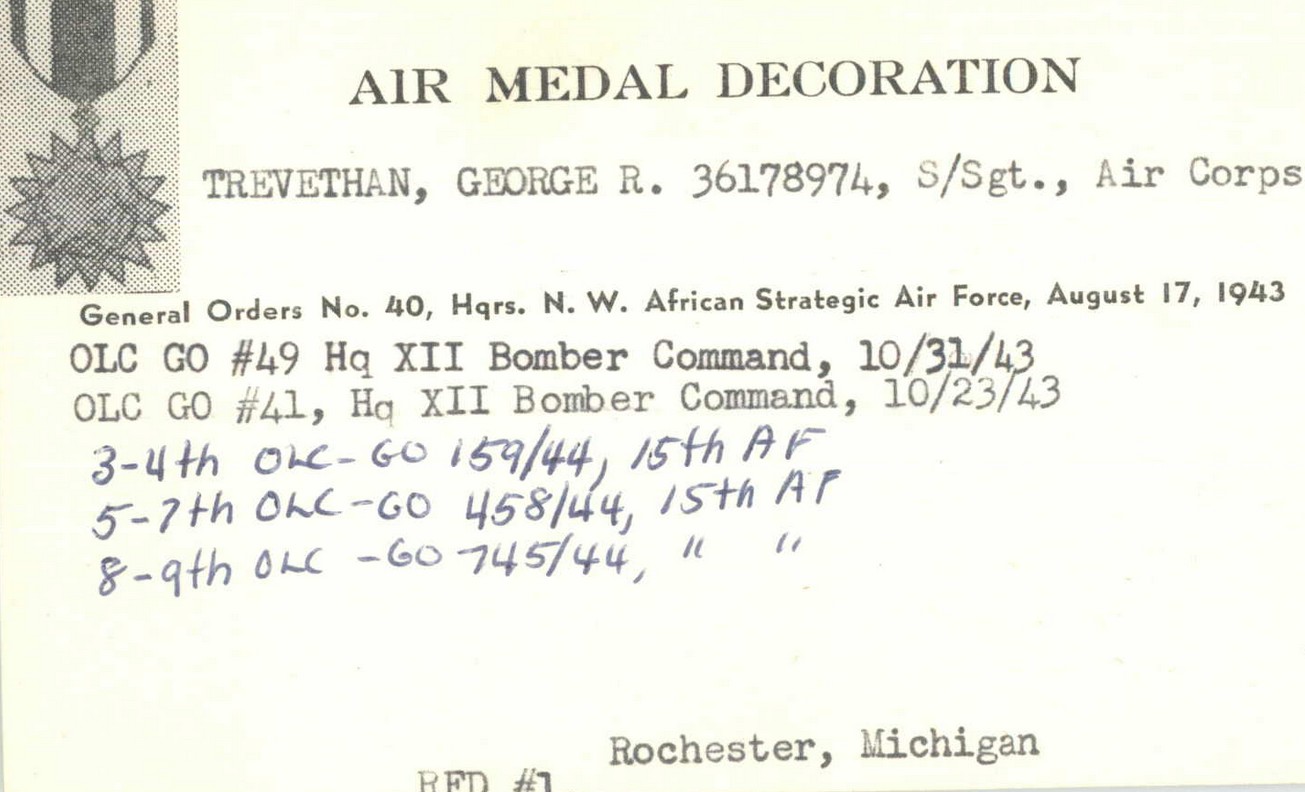 In April 1942, George entered the U.S. Army Air Forces, one of four Trevethan brothers to serve in uniform during the war. George was trained as a bombardier and waist gunner with a unit based in Italy. He completed 50 successful combat missions and was awarded an Air Medal.