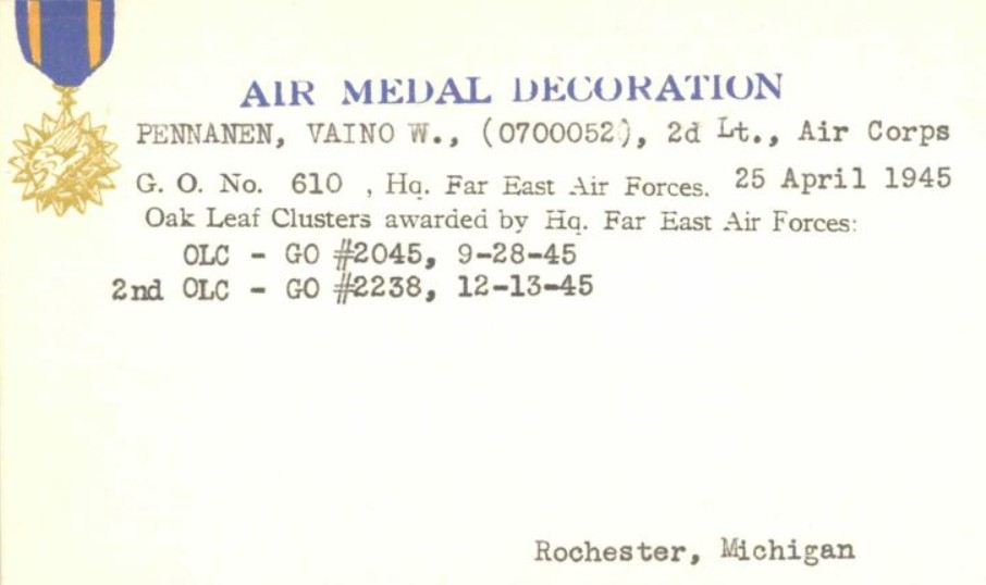 William Vaino “Bill” Pennanen (sometimes known as Vaino William Pennanen) was born in Harbor Beach, Michigan, on December 13, 1922, the son of Finnish immigrants Peter and Anna Nieminen Pennanen. The Pennanen family moved to Rochester when Bill was a teenager and lived on South Street. Bill attended Rochester High School and graduated in the class of 1941.